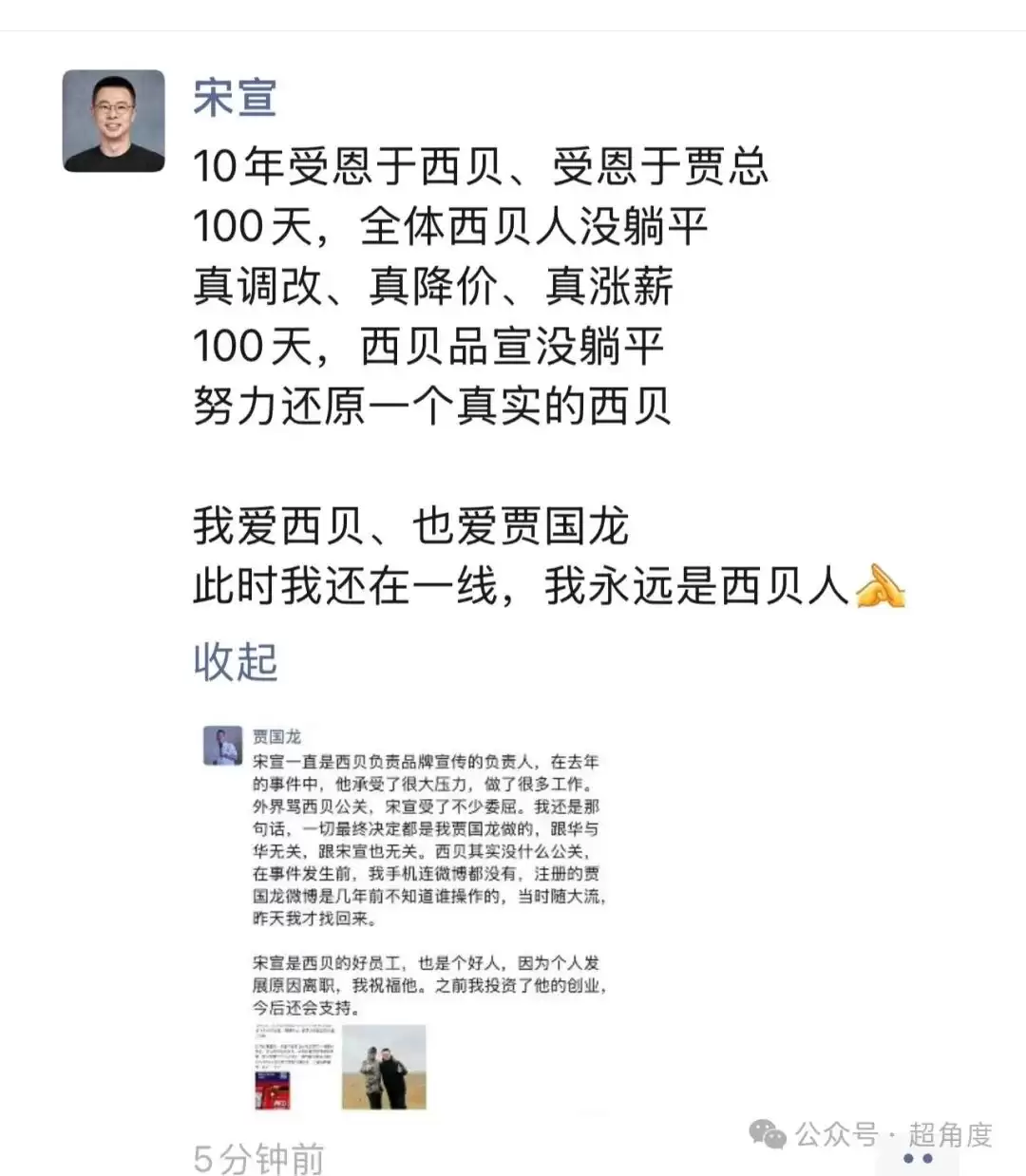 宋宣是西贝的优秀员工,也是一个好人。此次他是因个人发展原因离职,我衷心祝福他。之前我投资过他的创业项目,未来也依然会支持他。