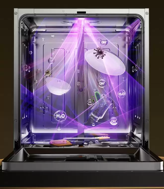 传统洗碗机的消毒逻辑,多依赖高温水洗或单一UV 紫外线照射。这类方式在餐具表面有效,但在餐具缝隙、腔体角落、叠放区域等“隐蔽空间”,往往存在消杀盲区。同时,高温方案还面临能耗高、材质适应性差等限制。