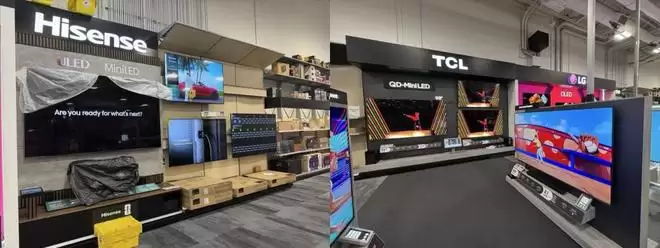 在百思买的电视专区,和中部的陈设专区,海信、TCL 品牌及其电视产品,连刷存在感,而且均在黄金位置。