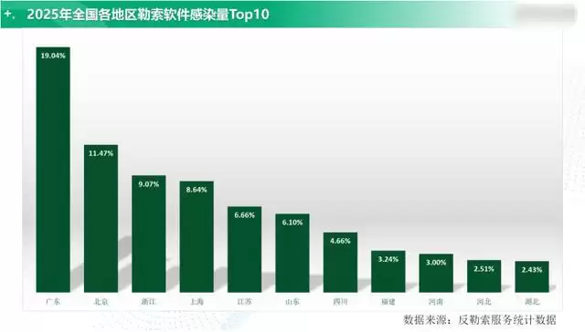 此外,2025年勒索软件攻击的地域分布保持稳定,仍集中在数字经济发达及人口密集地区。广东、北京、浙江位列受影响程度前三,这说明发达区域持续面临更高威胁。