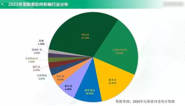 制造业、互联网及软件服务业以及服务业位列受害行业前三,医疗等敏感行业亦在其中。这些领域普遍具有信息化程度高、数据资产价值大、支付意愿强的特点,因此面临更大的暴露面和更高的勒索风险,成为攻击者持续聚焦的目标。