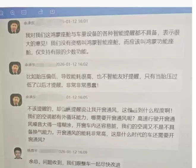 图片显示,余承东毫不留情地批评鸿蒙座舱的功能开发,直言某功能“非常愚蠢”,认为其仅支持有限功能,不应称为智能座舱,应该改名“功能座舱”。他言辞之激烈,丝毫不亚于贾国龙,同样充满了愤怒和不妥协。