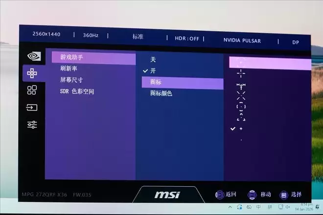 MPG 272QRF X36还拥有不少方便电竞玩家的功能,比如屏幕尺寸和屏幕比例切换,还有经典的电竞准星等。因为这些功能大家都很熟悉,所以在这里就不详细介绍了,再说了,直接用照片展示会显得更直观。