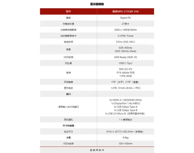 在详细介绍之前,我们还是先用微星的电竞显示器命名规则解读一下这个显示器:MPG不用多说,是微星旗下专注高性能电竞玩家的硬件系列。272,前面的27指的自然是屏幕尺寸,后者则是世代数。QRF,Q是指分辨率是QHD,也就是2560 x 1440;R是指显示器带RGB灯条和升降旋转支架;F指的是面板为Fast IPS/VA。最后的X36,X意味着刷新率大于240Hz,36则是刷新率360Hz的意思。又因为后缀里没有V,意味着面板不是VA,和前面的F相对应就是这块面板是Fast IPS。