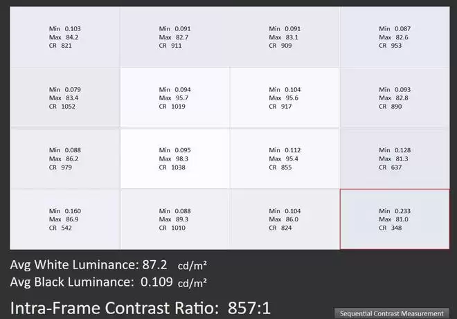 标准模式且亮度接近100nits设置下,MPG 272QRF X36的平均对比度为857:1。中间偏左那一块区域的对比度是比较高的,普遍能达到900:1至1000:1。