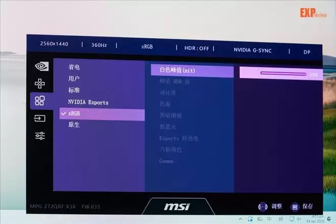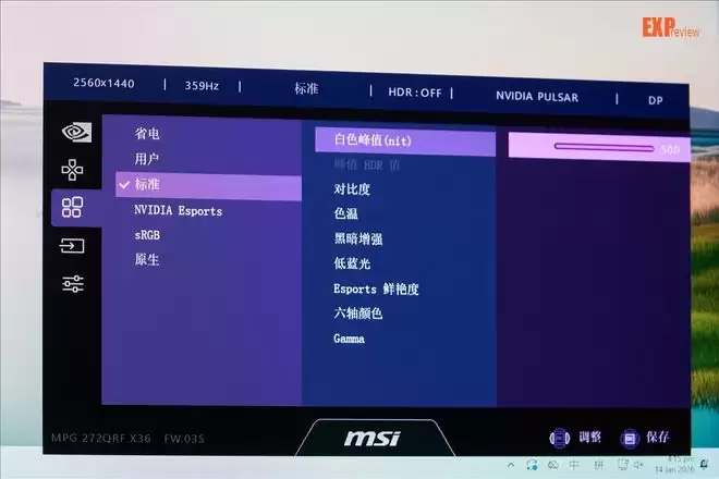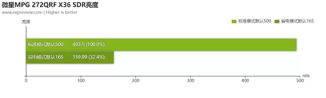 在初始启动时,MPG 272QRF X36会提醒你是否切换到标准模式,如果你选择“否”,则会保持在省电模式。标准模式下直接就是亮度拉满了,来到500;而省电模式的亮度是165(前提是把G-SYNC智能环境光关掉)。关于这点我确实需要注明一下:G-SYNC Pulsar显示器的亮度滑杆和别的型号确实有点不同,区间是100-500。