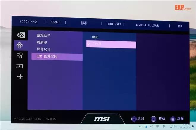 因为MPG 272QRF X36是一台专注电竞体验的显示器,所以它在色彩设置这块上倒是有种“够用就好”的意味:在可用的专业模式中,它仅有sRGB这一选项。不过令人比较好奇的是,在游戏功能中,显示器又提供了SDR色彩空间这一子项供玩家选择。不过,无论如何,能够测的我们都会测。