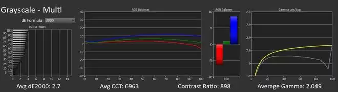 标准模式下,MPG 272QRF X36的伽马值为2.049,白平衡ΔE为2.7。色温则是6963K,比较冷。而显示器菜单里提供了详细的色温和伽马设置,玩家可进一步自定义。