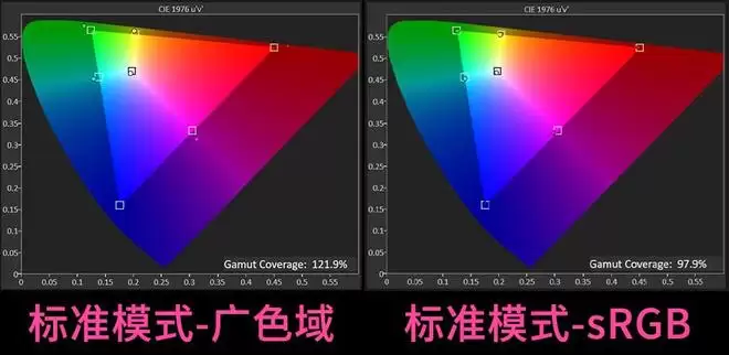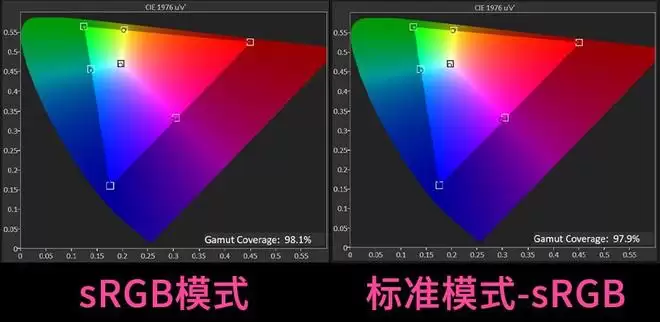 如果保持标准模式不变,在SDR色彩空间这个选项中把色域设置为sRGB的话,其实就是等于色域缩限,这时候的sRGB色域覆盖为97.9%。