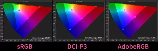 在标准模式 + 广色域这个设置中,sRGB的色域覆盖为121.9%,P3色域覆盖则是89.2%,AdobeRGB色域覆盖是82.8%。