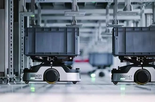 作为京东物流在英国布局的自动化标杆仓库,这一智狼仓占地面积超3000平方米,内部部署近200台智狼机器人。得益于这些智能设备的高效运转,该仓库拣货及出库效率实现约4倍的大幅提升。
