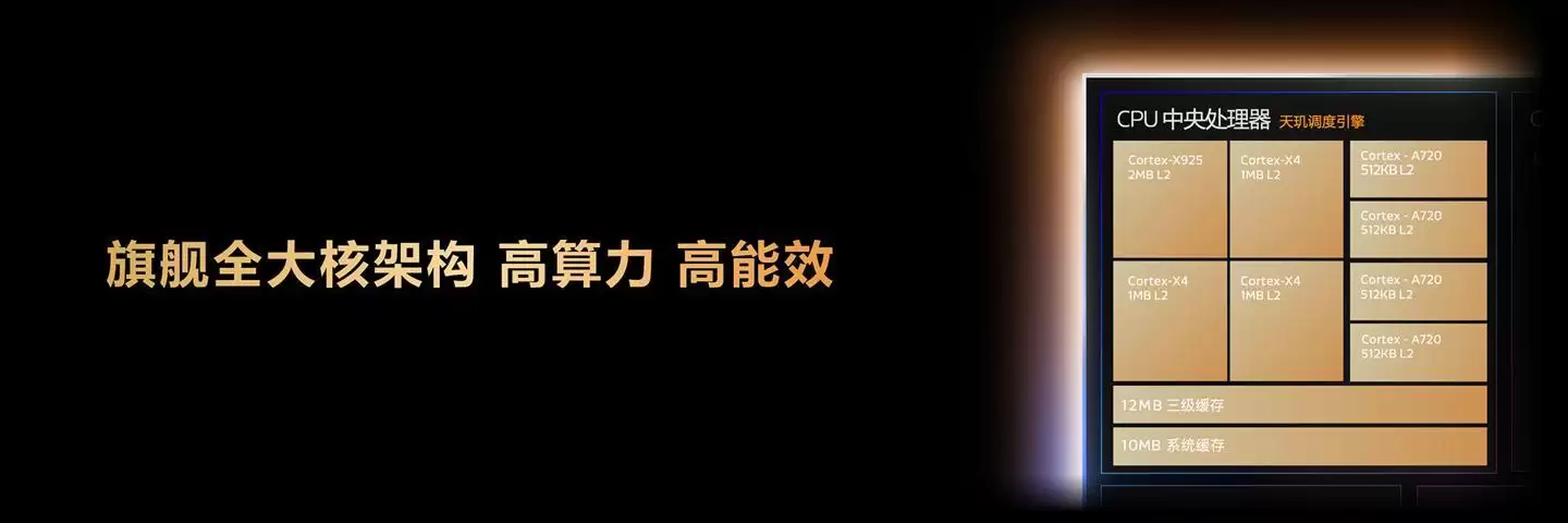 据介绍,天玑9500s采用了旗舰级全大核CPU架构,包含一颗Cortex-X925超大核,并基于台积电第二代3纳米制程工艺打造,集成了超过290亿个晶体管。该CPU架构搭配第二代天玑调度引擎,实现了出色的性能与能效。它还支持超级内存压缩技术,显著提升了资源调度效率,开启后应用启动速度较开启前提升高达44%。此外,该芯片还配备了高达19MB的CPU高速缓存和10MB的高速系统缓存,为复杂任务处理提供了充足的数据带宽。