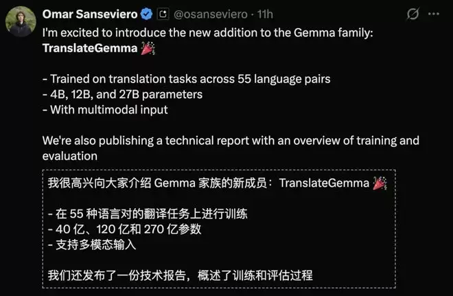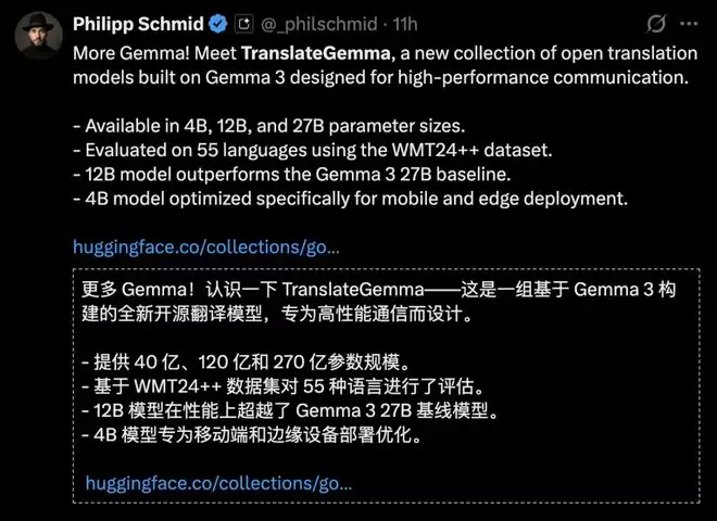 基于Gemma 3,谷歌发布了开源翻译模型TranslateGemma,它非常酷: