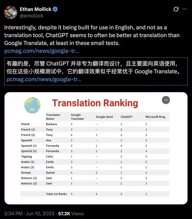 2024年,沃顿商学院教授Ethan Mollick就注意到,ChatGPT翻译能力出色: