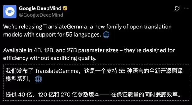 不同于OpenAI几乎悄无声息的上线ChatGPT翻译,谷歌全网高调宣布发布了支持55种语言的开源翻译模型TranslateGemma。