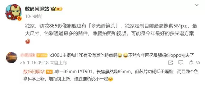 而且在与网友的互动中,博主提到vivo X300 Ultra的芯片功耗表现优于竞品,这主要得益于骁龙8 Elite Gen 5的迭代以及vivo内部对V系列影像芯片的深度调优。
