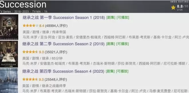 且IMDb一路上涨到27万人打出的8.8分,更牛的是,短短四季的《继承之战》竟然连着三次拿下了艾美奖和金球奖的最佳剧集大奖...在各种评奖也是嘎嘎乱杀,直接超神!