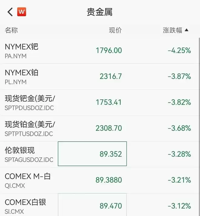 贵金属集体下挫,现货黄金失守4590美元/盎司,日内跌0.58%。现货白银一度向下触及89美元/盎司,日内跌3.28%。纽约期银日内跌幅超过3%,现报89.47美元/盎司。现货铂金、钯金跌幅均接近4%,伦锡日内暴跌达到8%,一度跌至48115.00美元/吨。伦镍日内跌5%,至17630美元/吨。