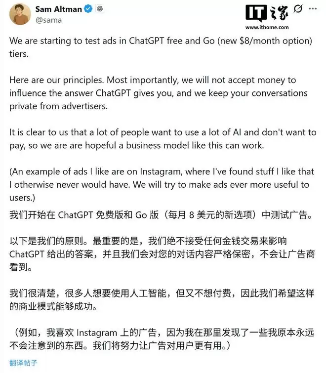 OpenAI明确表示,广告将以独立模块的形式呈现,极有可能放置在AI生成答案的底部区域,并会进行清晰的标签化处理,确保用户能够一目了然地分辨“AI回答”与“推广内容”。IT之家附上最新的官方推文截图以供参考:
