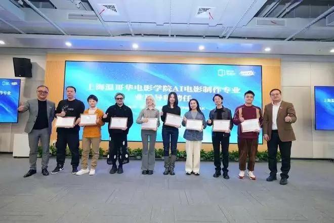 活动现场同步举行了上海温哥华电影学院AI电影制作专业业界导师聘任仪式。上海温哥华电影学院执行院长程波现场介绍了温影AI电影制作专业创办背景与培养定位。作为国内高校首个开设的AI电影制作专业,该专业依托学院在影视教育领域的深厚积淀与前瞻布局,秉持“开门办学、融汇产业”的理念,着力构建“课程与产业同步、实训与市场对接、人才与企业贯通”的教学体系。他表示,该专业目前已正式启动招生,学院期待与各界携手,共同培育兼具技术能力与艺术创造力的新一代复合型人才,助力AI视听产业的生态发展与持续进步。现场,程波、陈晓达共同为潘雨莹、蔡倩雯、陈发灵、刘如山、言川、刘婧博、印隽、严健等嘉宾颁发聘书。