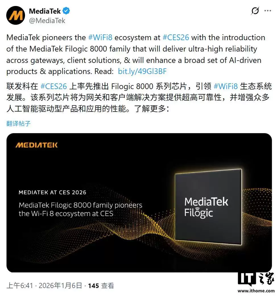 IT之家1月6日消息,科技媒体Android Headline今日(1月6日)发布博文称,在CES 2026展会期间,联发科发布Filogic 8000系列芯片,打响了进军Wi-Fi 8生态系统的第一枪。