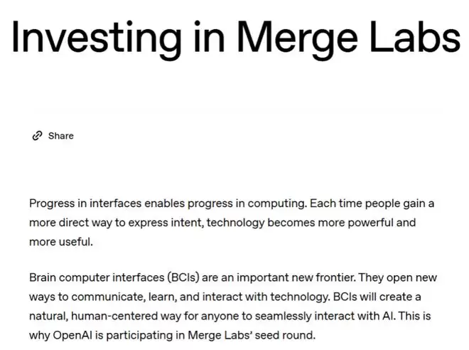 ▲OpenAI参与Merge Labs投资最新公告(图源:OpenAI正式)