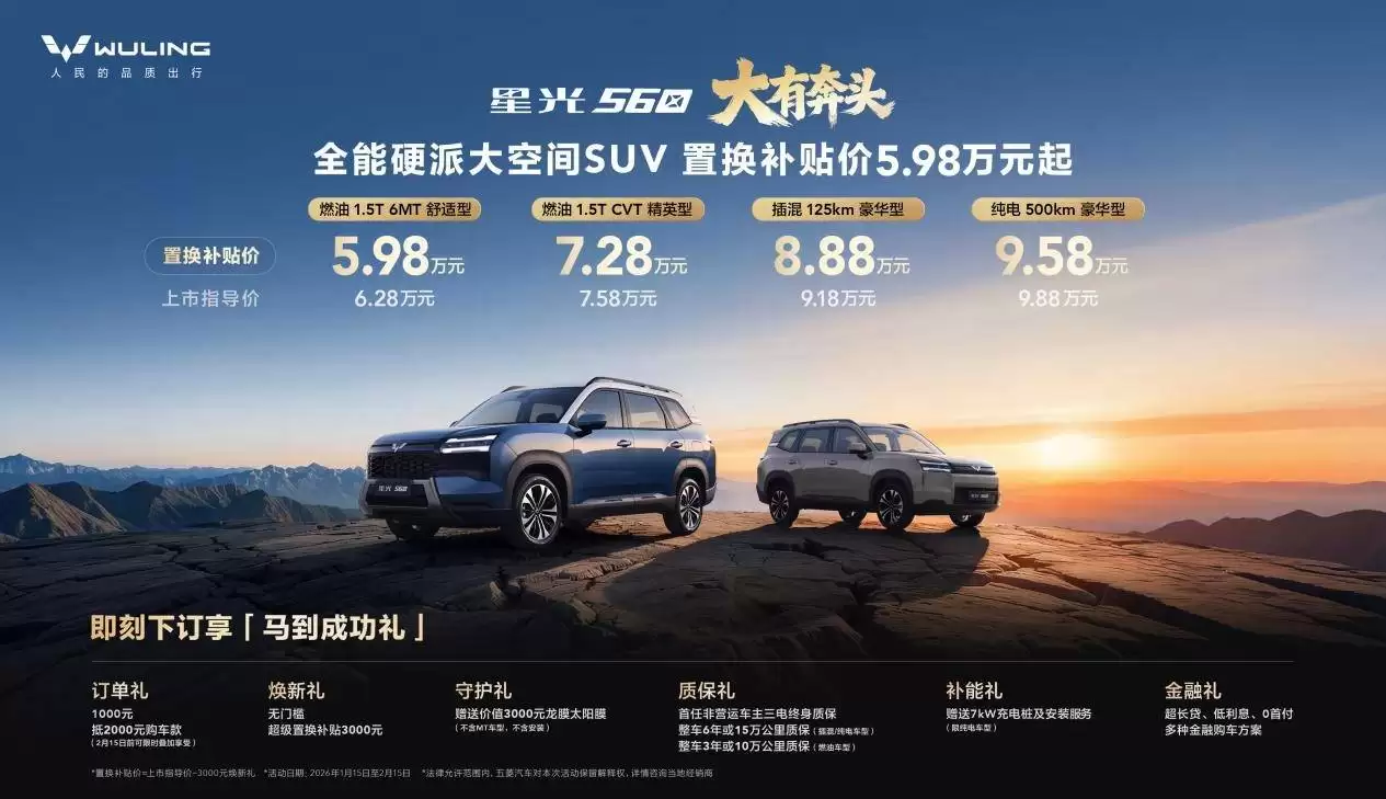 五菱汽车近日正式发布了旗下首款硬派风格SUV——星云560,凭借“一车三动力”的全场景适应能力,重新定义了六万元级中型SUV的市场标准。新车提供燃油、插混、纯电三种动力版本,共四款配置车型,置换补贴后售价区间为5.98万元至9.58万元,较原指导价下调3000元,展现出极强的市场竞争力。