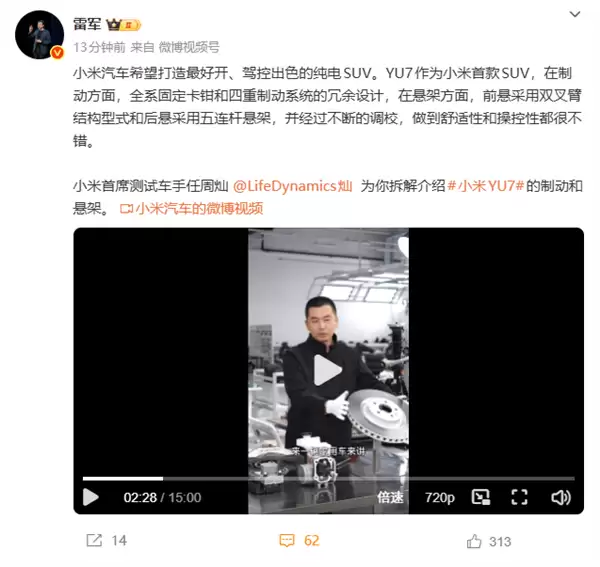 在核心技术层面,YU7展现了小米在底盘调校领域的深厚积累。制动系统采用全系固定卡钳与四重冗余设计,确保极端工况下的稳定性;悬挂系统则通过前双叉臂与后五连杆的组合,经反复调试实现操控性与舒适性的平衡。雷军强调,这种“硬实力”是小米汽车区别于传统车企的关键优势。