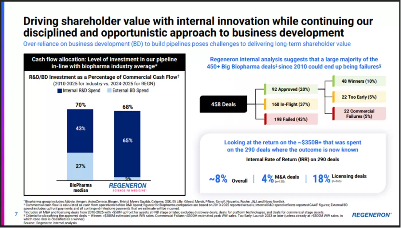 这并非再生元第一次提出类似策略。2024-2025年,公司在BD方面的现金投入仅占总经费的3%,远低于27%的行业平均水平。