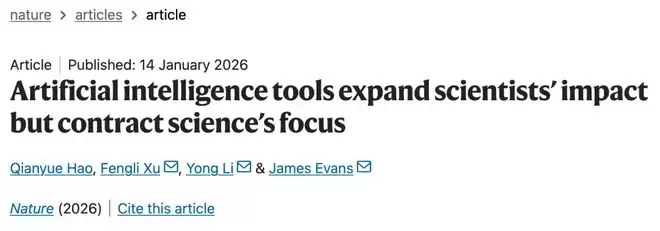 2026年1月,清华大学电子工程系徐丰力、李勇教授联合芝加哥大学团队在《Nature》发表重磅研究,通过对4100余万篇科研论文的跨45年分析,首次揭示了一个令人深思的矛盾现象:AI正显著提升科学家的个人生产力,却在无形中收缩了科学探索的集体疆域。