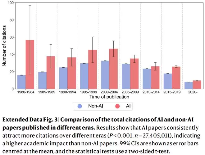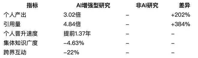 分析显示,使用AI的科学家在个人层面获得显著优势:年均发表论文量高出3.02倍;获得引用量高出4.84倍;从初级晋升资深平均提前1.37年;AI论文年均引用量高出98.7%