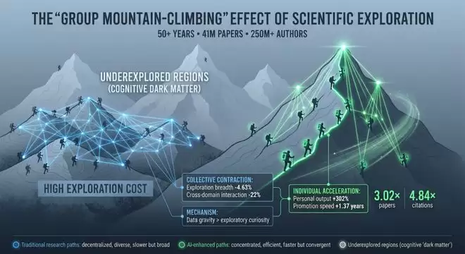 李勇教授解释道,「我们发现,AI的高效引导了研究者集体涌向少数适合AI研究的热门山峰,这种群体登山模式虽加速了已知问题的解决,却无形中固化了科学探索的路径,系统性地削弱了科学家向未知山峰探索的广度。」