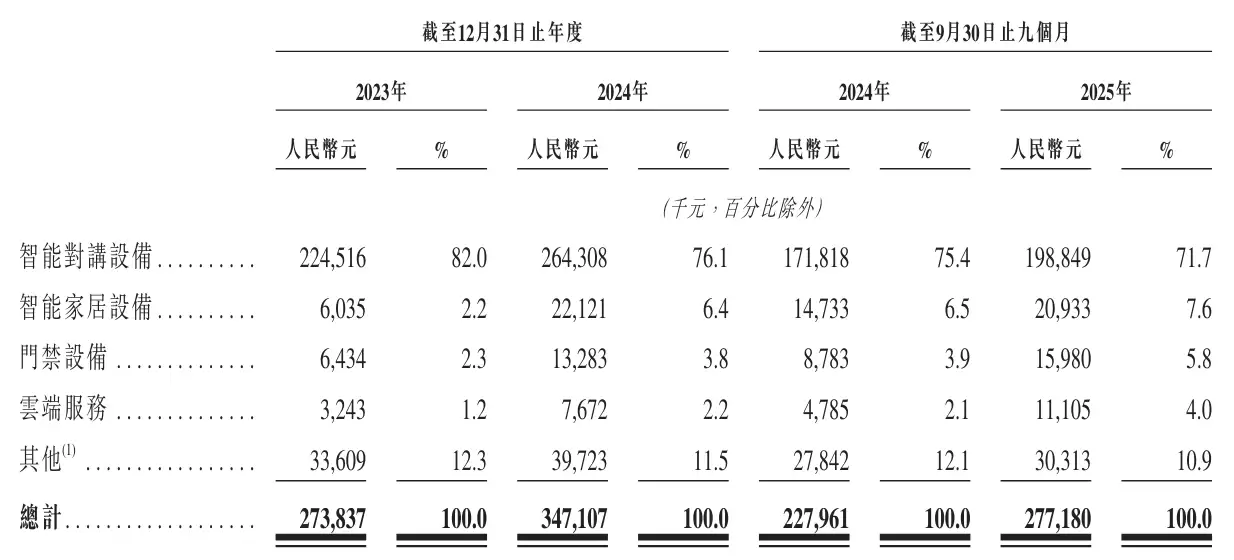 从收入构成来看,2025年前九个月,公司智能对讲设备贡献收入1.99亿元,占总收入的71.7%;智能家居设备收入为2093万元,占比7.6%;门禁设备收入1598万元,占比5.8%;云端服务收入1111万元,占比4%。