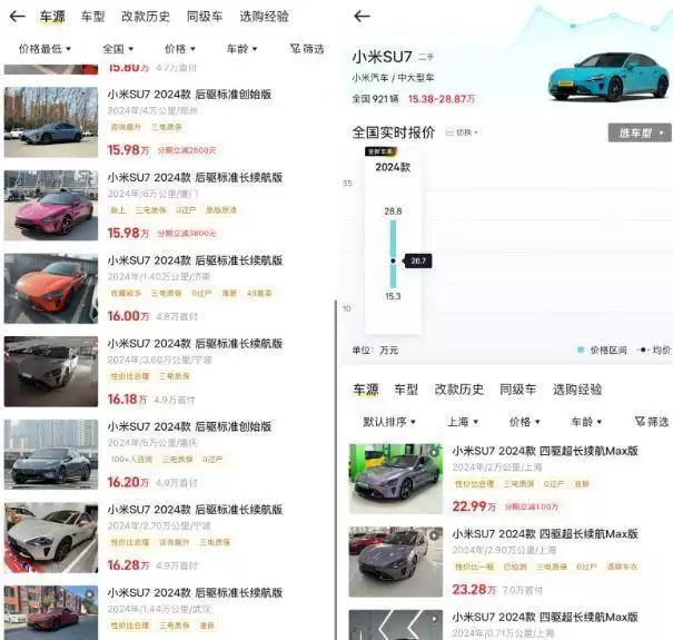根据二手车交易平台的数据,目前小米SU7的全国二手均价已跌至20万元左右,最低成交价甚至下探到15万元区间。这一价格波动速度远超传统燃油车首年折旧水平,甚至让一些准新车(行驶里程不足百公里)的二手价比新车直接便宜2万元,而行驶里程超过2万公里的车辆,贬值幅度更令车主“心碎”。