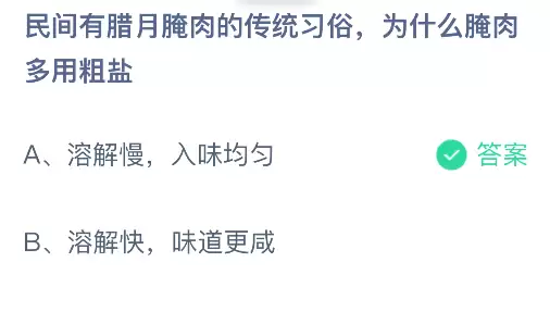 民间素来有腊月里腌肉的传统习俗,为何腌制时多选用粗盐呢?支付宝小鸡课堂这就给大家揭晓答案!每天只需花一分钟参与答题,就能赚取饲料喂养小鸡,还能顺手贡献一份爱心。过程轻松简单,意义却不小!2026年1月19日蚂蚁庄园的小鸡课堂题目正确答案是【溶解慢,入味均匀】,粗海盐颗粒大、溶解速度缓,能持续释放咸味,让肉质里外咸淡更一致,这正是古法腊味的精髓所在。