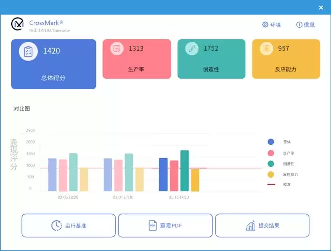 在跨平台的CrossMark生产力测试中,此次测试平台的总体得分可达1420分,其中在创造性上的单项得分达到了1752分,生产率单项可达1313分,反应能力可达957分,足以满足游戏之外绝大多数生产力工作的需求。