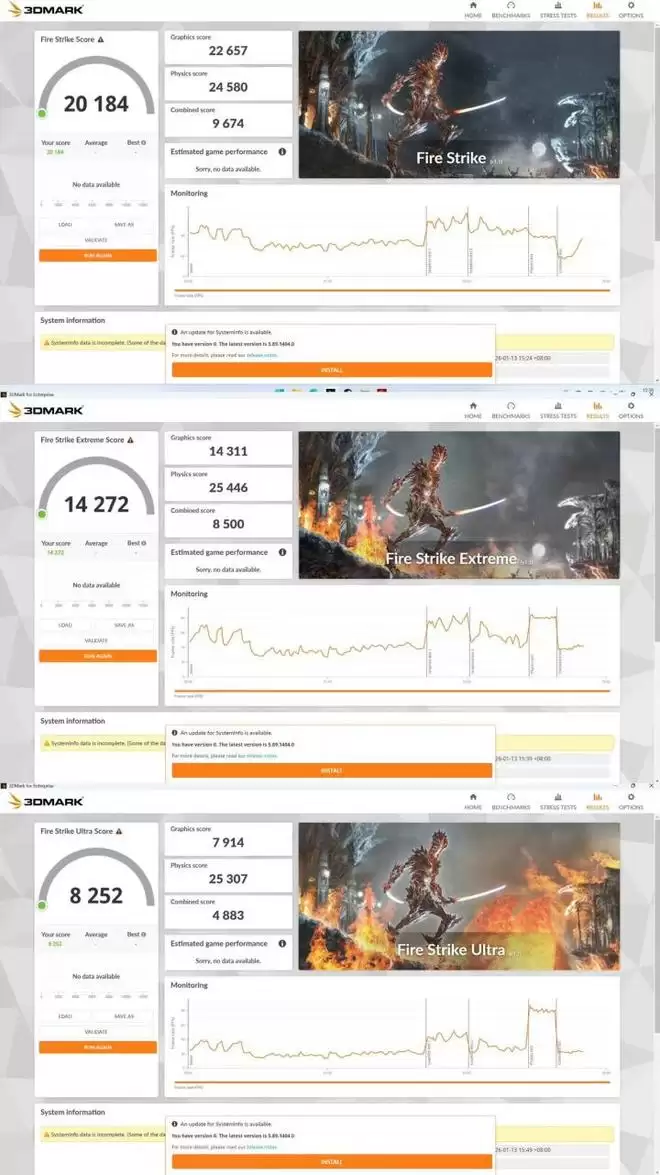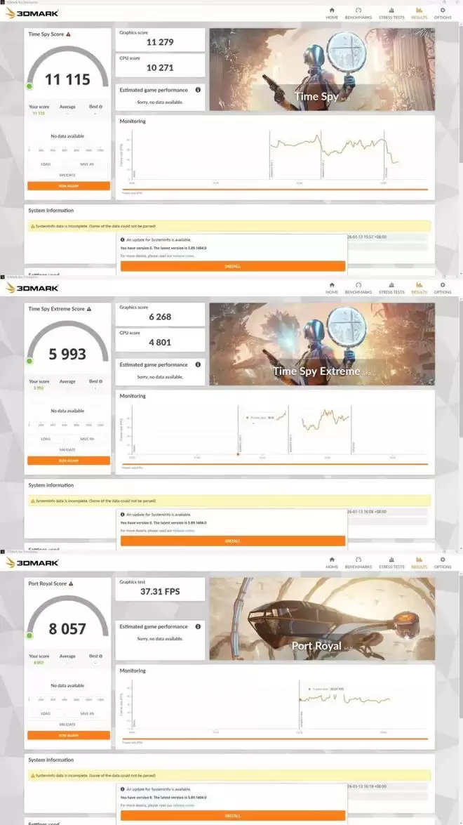 首先在性能测试中,使用业内通用的3Dmark软件来进行测试。包括FHD分辨率下的Fire Strike测试、2K分辨率的Fire Strike Extreme测试和针对4K游戏的Fire Strike Ultra等三个场景,以及针对DX12的TimeSpy与TimeSpy Extreme测试和Port Royal光线追踪测试。
