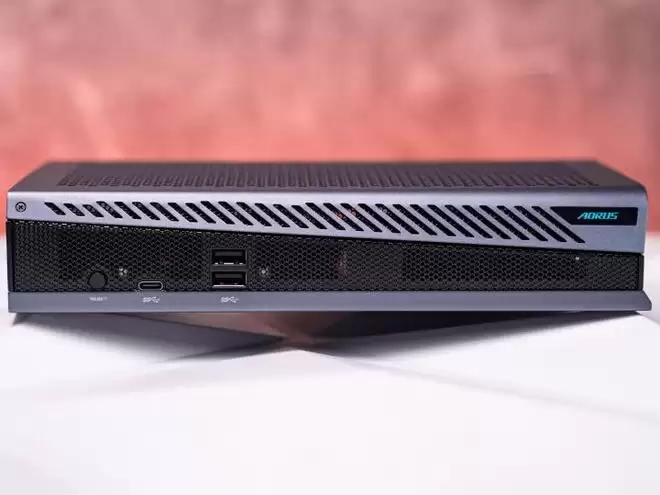 外观正面采用菱形网格面板,兼顾散热通风与视觉质感,RGB灯效藏在面板边缘,可通过技嘉控制中心自定义光效模式,灯光无论是大小、位置还是效果都十分低调不刺眼。机身外壳采用高强度材质,表面经过磨砂处理,不易沾染指纹,显卡坞四角采用圆润化处理,摆放与握持时更加精致。