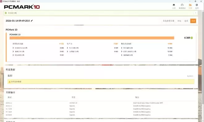在业内通用的PCMARK10基准测试中,分数可达6369分。其中常用基本功能9123分,生产力方面7687分,其中数位内容创作分数最高,可到9999分。