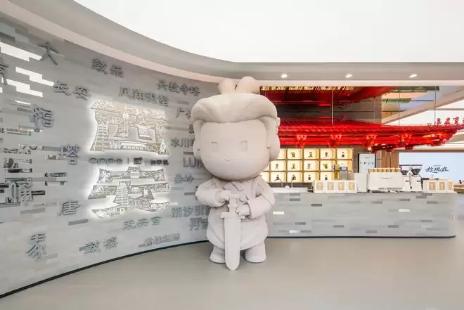 为了重现古代“长安三万里”的辽阔诗境,西安旗舰店参考古都“八水绕长安”的历史格局,首次将“水”之意象融入室内空间,实现山水意境同当代艺术交织。同时,门店对西安标志性IP进行创意重塑,打造全新形象「兵马俑小欧」,该形象既保留将军俑标志性的站姿原型,又创新塑造出松弛有趣的坐姿造型。室内外设置的俑像彼此呼应,形成历史与当下的生动对话。