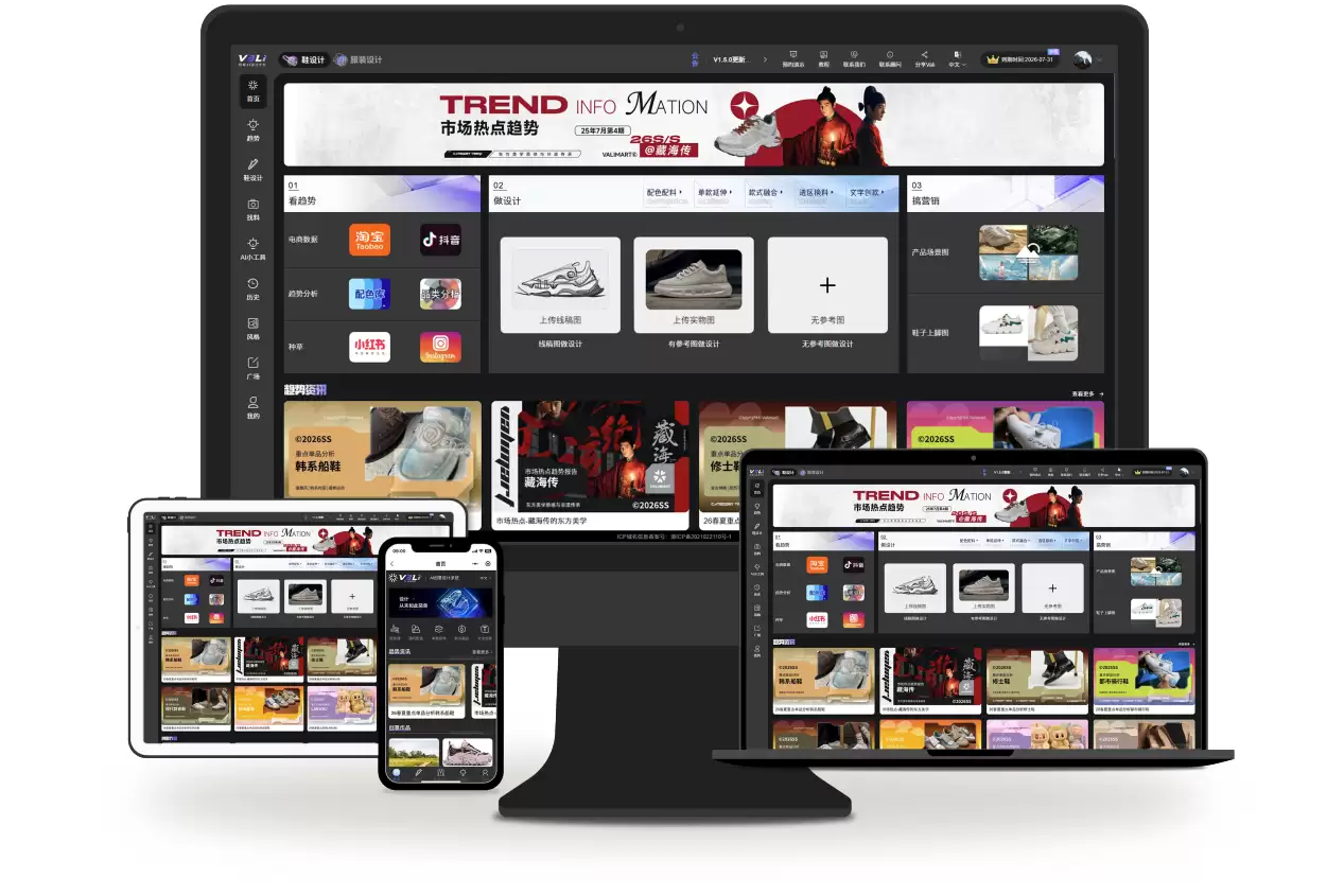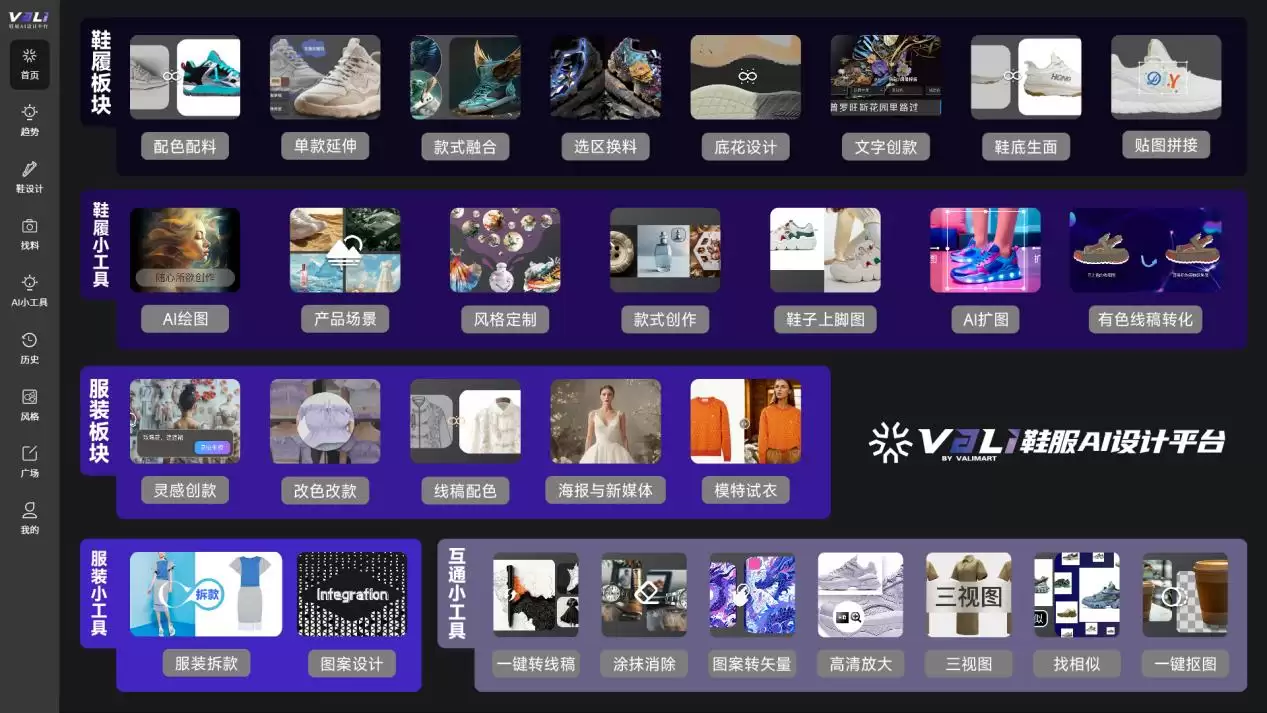 传统鞋服设计在很大程度上依赖设计师的个人经验,流程上从草图构思到实物打样周期漫长,且试错成本高昂。VALI鞋服AI设计平台则反其道而行,通过数据驱动的方式,构建了一套专业化的功能体系。