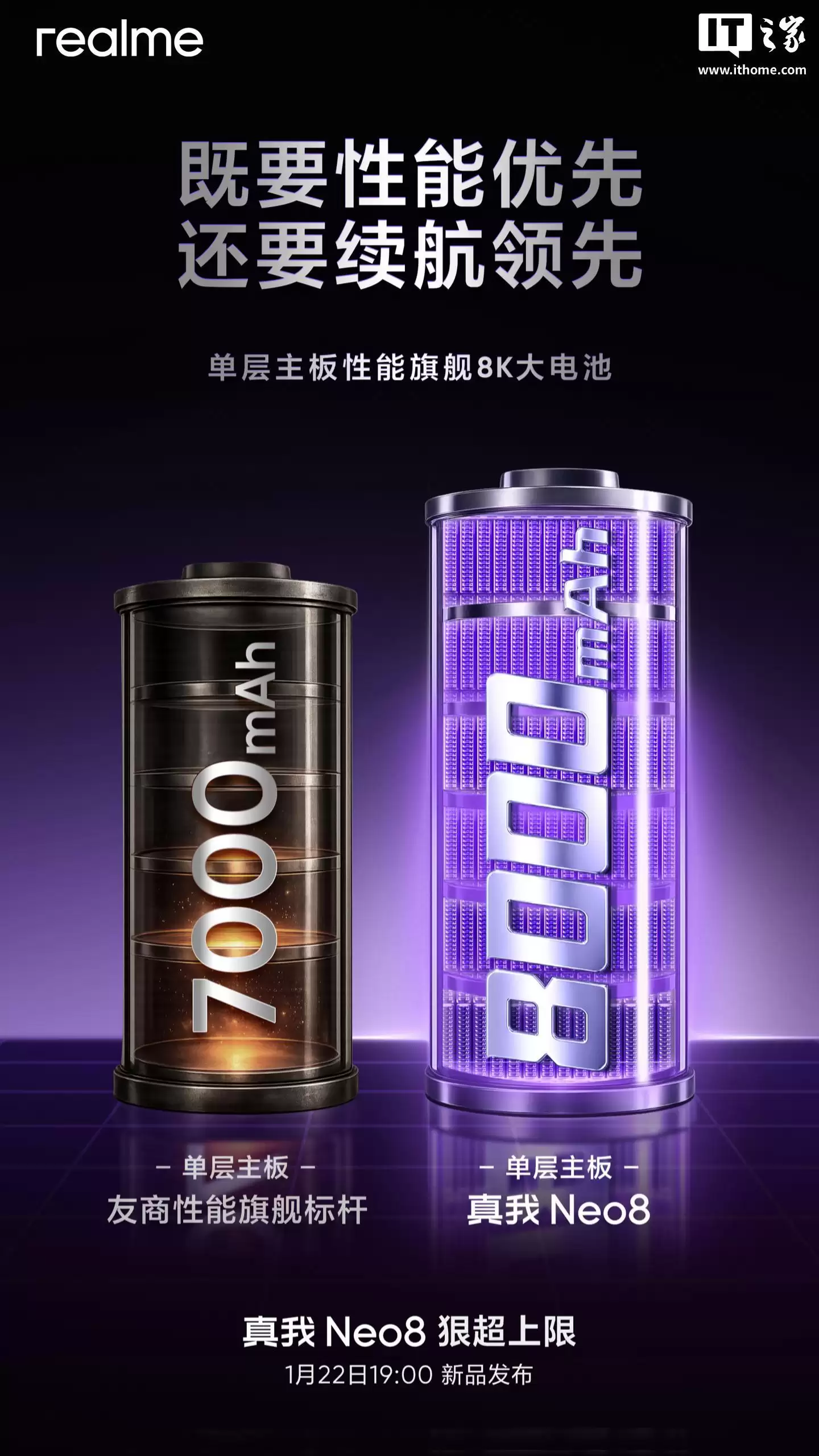 1月19日,来自IT之家的消息显示,真我realme副总、全球营销总裁兼中国区总裁徐起今日发文,为其新款机型真我Neo8预热。据悉,这款手机创新性地采用了单层主板结构,并在此基础上搭载了一块容量高达8000mAh的泰坦电池。这一电池容量,比同样采用单层主板设计的性能旗舰标杆机型还要多出1000mAh。