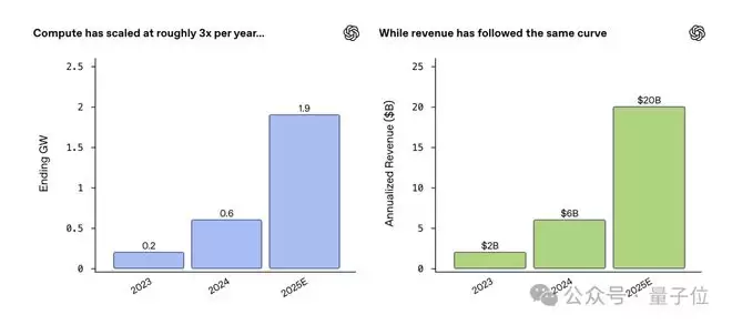 根据报告中的数据,2024到2025年间,OpenAI算力增长9.5倍,收入也呈现出相同的增长曲线,同比增幅达到三倍,三年内增长了10倍。