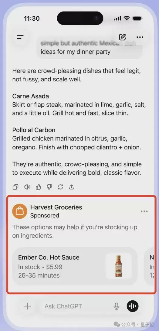 广告将出现在ChatGPT回答的底部,并明确标注为“赞助内容(sponsored)”。