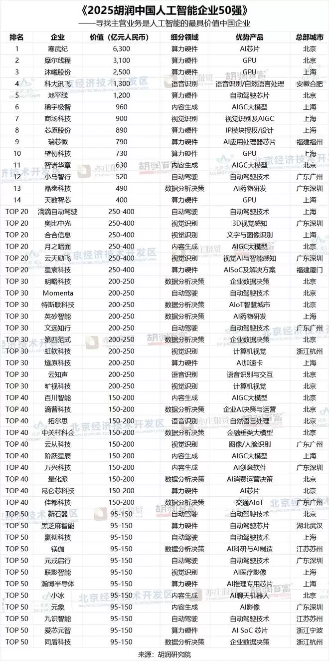 《2025胡润中国人工智能企业50强》按照企业价值进行排名。上市公司市值按照2026年1月9日的收盘价计算,非上市公司估值参考同行业上市公司或者根据最新一轮融资情况进行估算。这是胡润研究院第二次发布该榜单。
