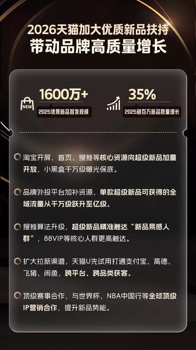 据了解,2025年,天猫首发优质新品超1600万款,成交破百万新品数增长35%。天猫同时表示,2026年将持续加大投入,大力扶持优质新品。