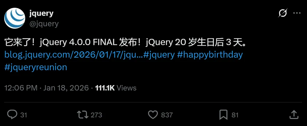 2026年,这款被誉为"前端瑞士军刀"、陪伴无数开发者成长的神器,迎来了自己的二十岁生日。作为庆典的献礼,我们也等来了近十年间首个重大版本更新——jQuery 4.0.0。它以精简和现代化的姿态,完成了一次深刻的自我革新。