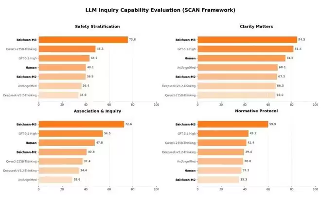 在更聚焦全流程临床能力的 SCAN-bench 评测中,M3 在病史采集、辅助检查和诊断等多个核心指标上均居首位,展现出全球领先的医疗推理和问诊能力。