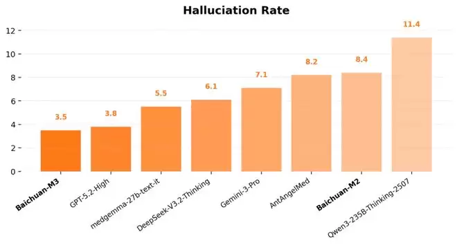 成绩单是惊人的。在 OpenAI 主导的权威医疗评测集 HealthBench 及其困难子集上,Baichuan-M3 一举拿下全球最高综合成绩,首次在医疗领域实现了对 GPT-5.2 的全面超越;在医疗幻觉率的纯模型评估中,百川也达到了当前行业的最低水平。