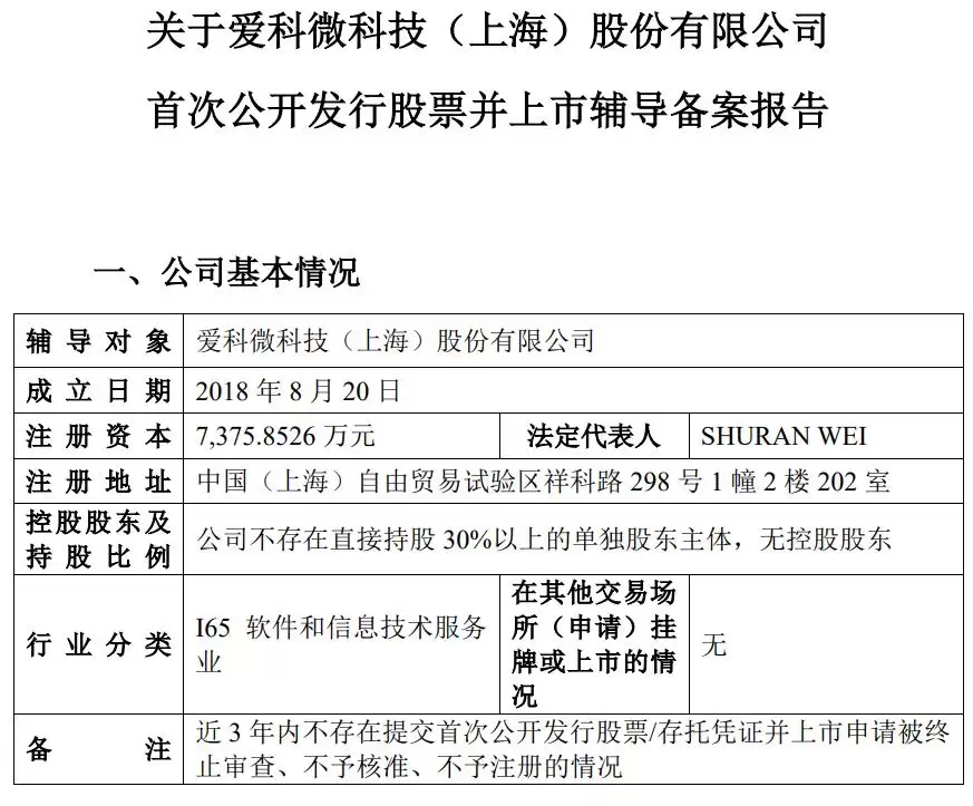 根据爱科微官方介绍,公司成立于2018年,是一家聚焦于无线通讯领域的高端芯片设计公司。辅导备案报告显示,该公司不存在直接持股30%以上的单独股东主体,无控股股东。